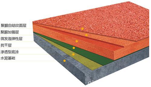 全塑型塑膠跑道分兩層結(jié)構(gòu),底層以再生膠粒與單組份膠水按比例混合攪拌后經(jīng)由專業(yè)施工隊鋪設(shè)壓平,面層由EPDM橡膠顆粒與單組份膠水混合而成,厚度為13mm。